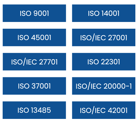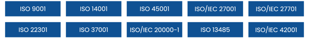 Helping businesses prepare for and achieve ISO certifications such as ISO/IEC 27001 (Information Security), ISO 9001 (Quality Management), ISO 14001 (Environmental Management), ISO 45001 (Occupational Health and Safety), ISO/IEC 20000-1 (Service Management), ISO 22301 (Business Continuity), ISO/IEC 42001 (Artificial Intelligence) and more.